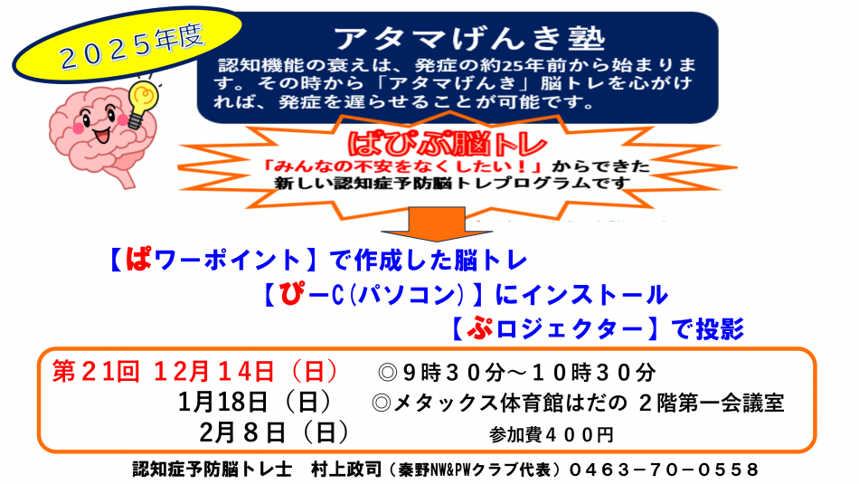 今年から、足を鍛えたら、次は脳ですと、「アタマげんき塾」を