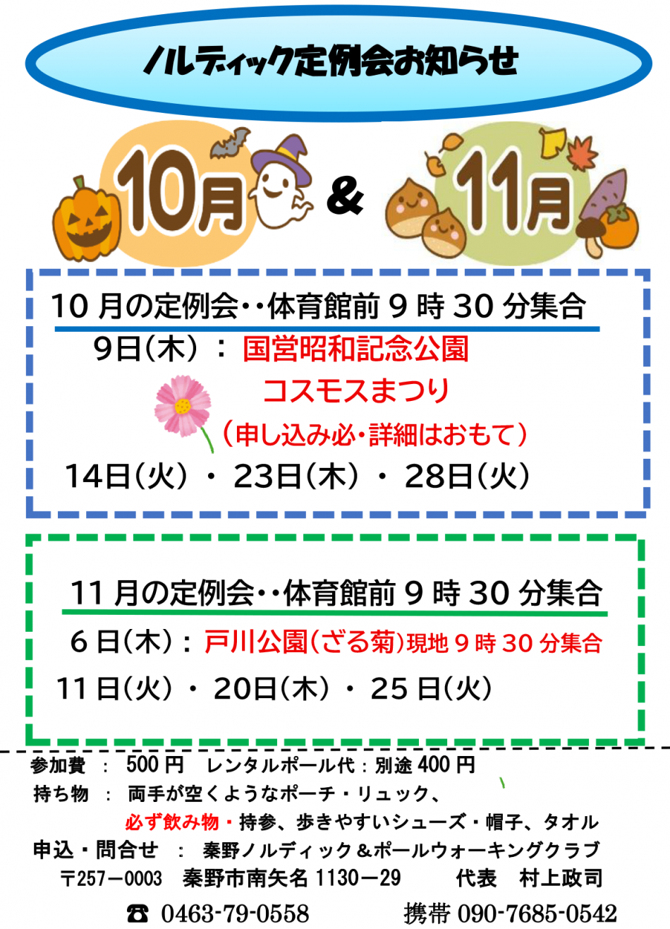 10月30日(木) | 体育館前9:30集合 基本歩行とグループごと距離でわかれる ピクニック広場で全員休憩とレクレーションゲームで楽しむ 解散は体育館前11:15 |