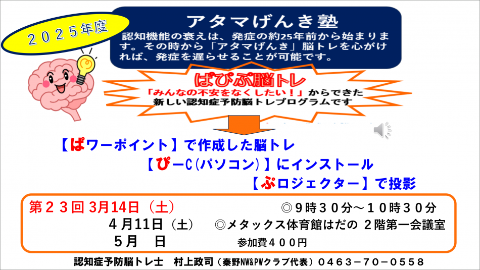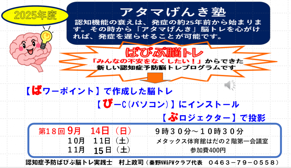 今年から、足を鍛えたら、次は脳ですと、「アタマげんき塾」を