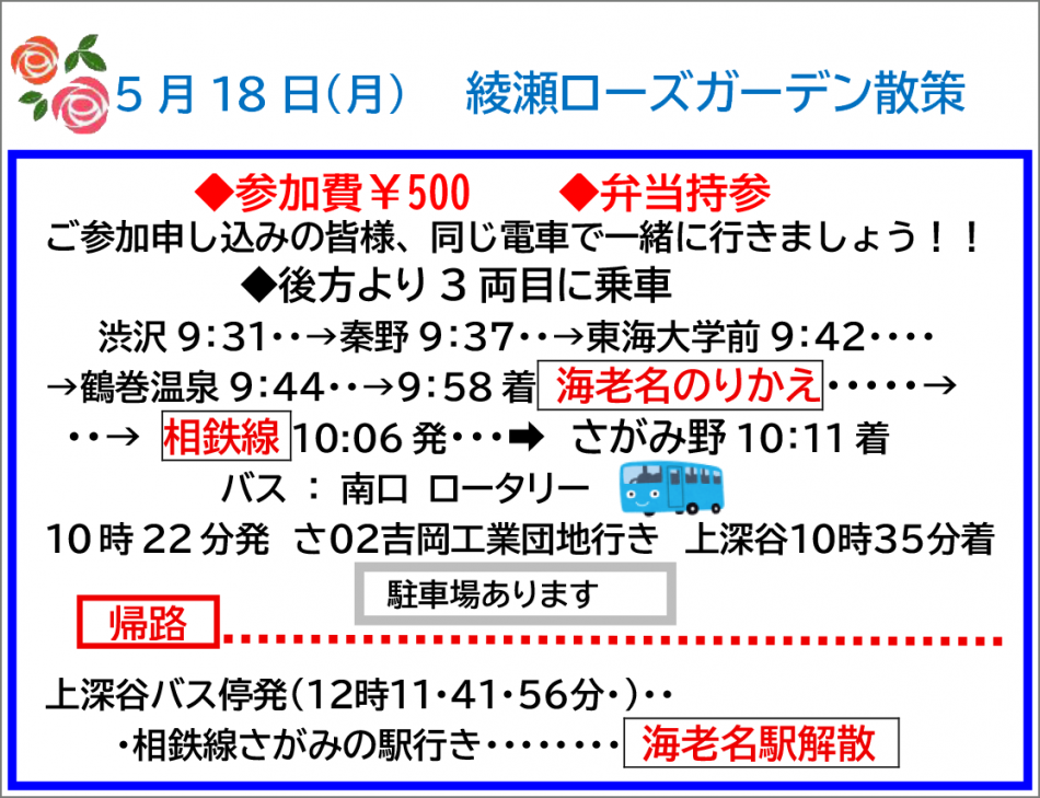 5月:14日、26日、18日(綾瀬ローズガーデン)19日から変更
