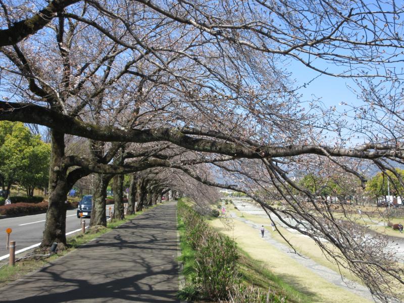 桜道の土手から 各地で桜の開花状況が発表されました。 ここ水無川沿いも数輪花が咲いています。 既に何件か屋台が出ています